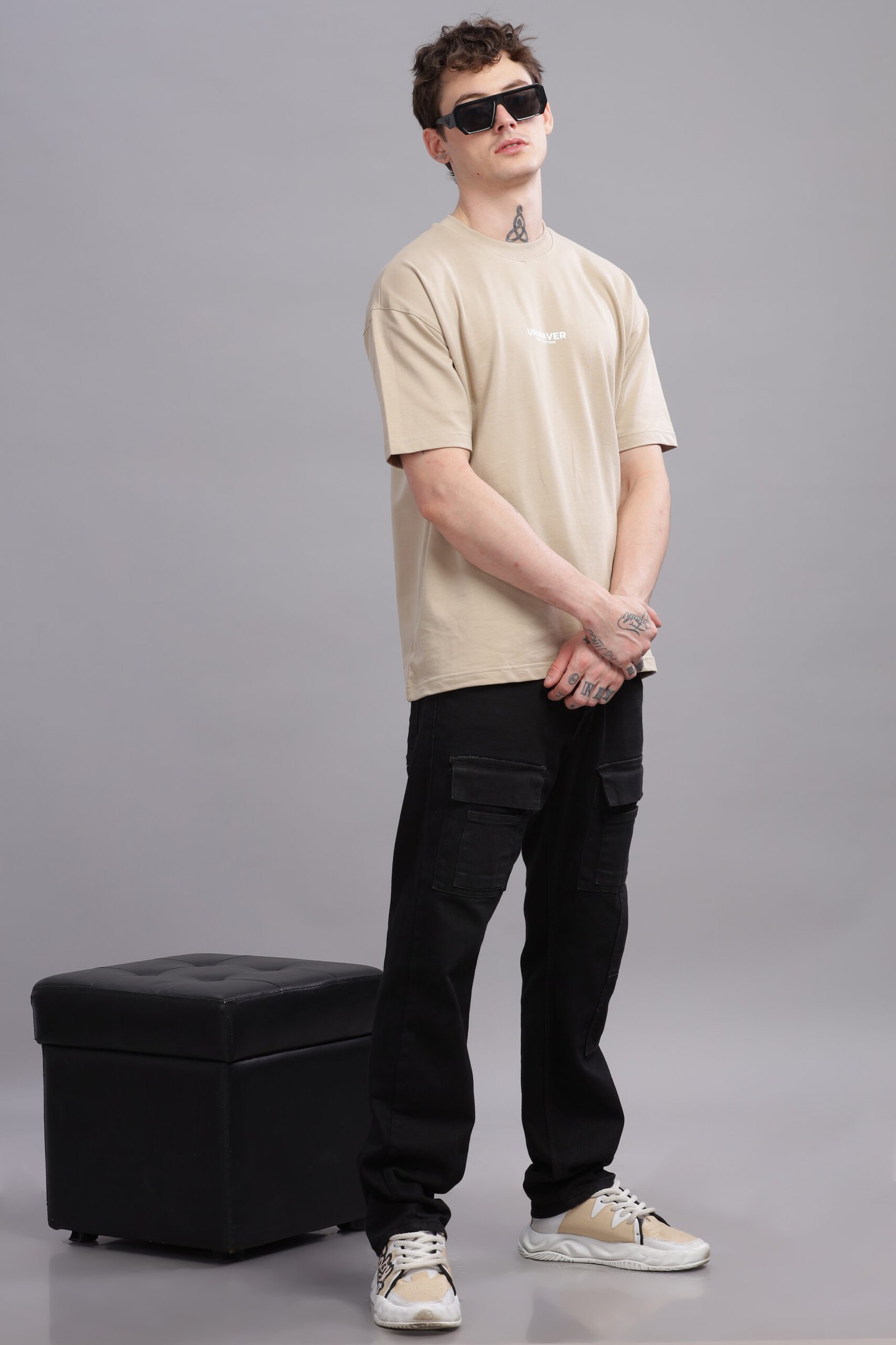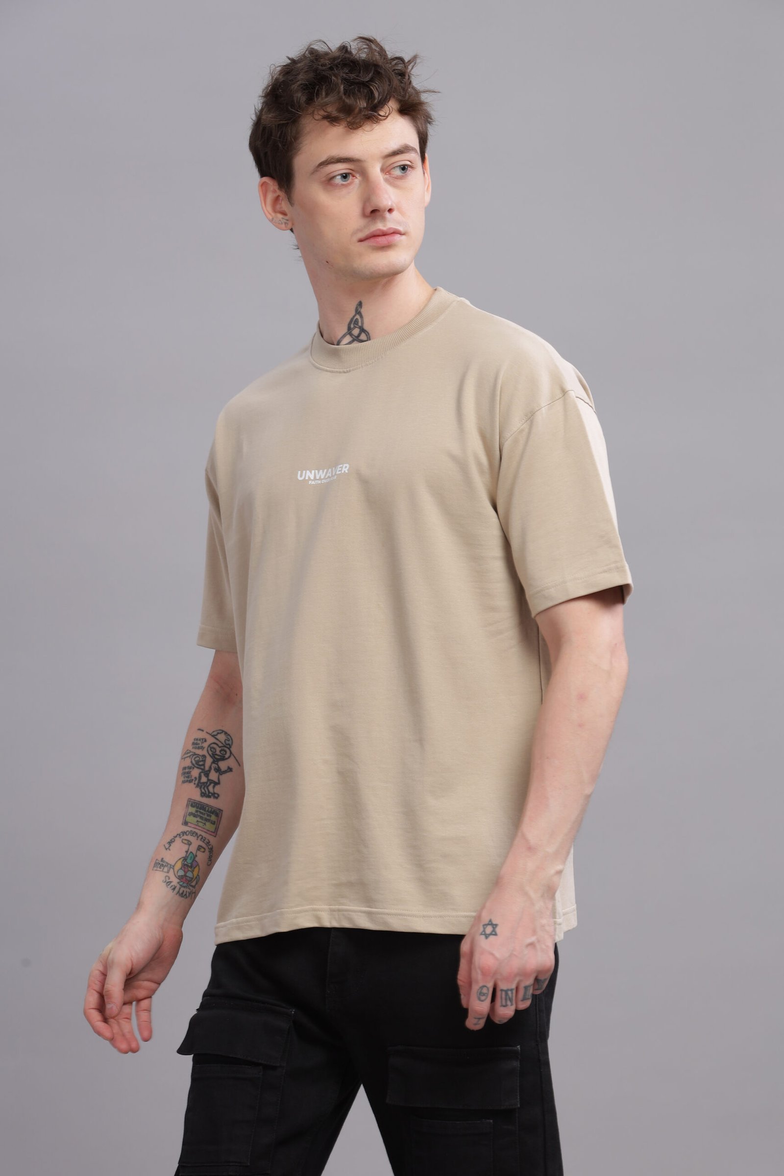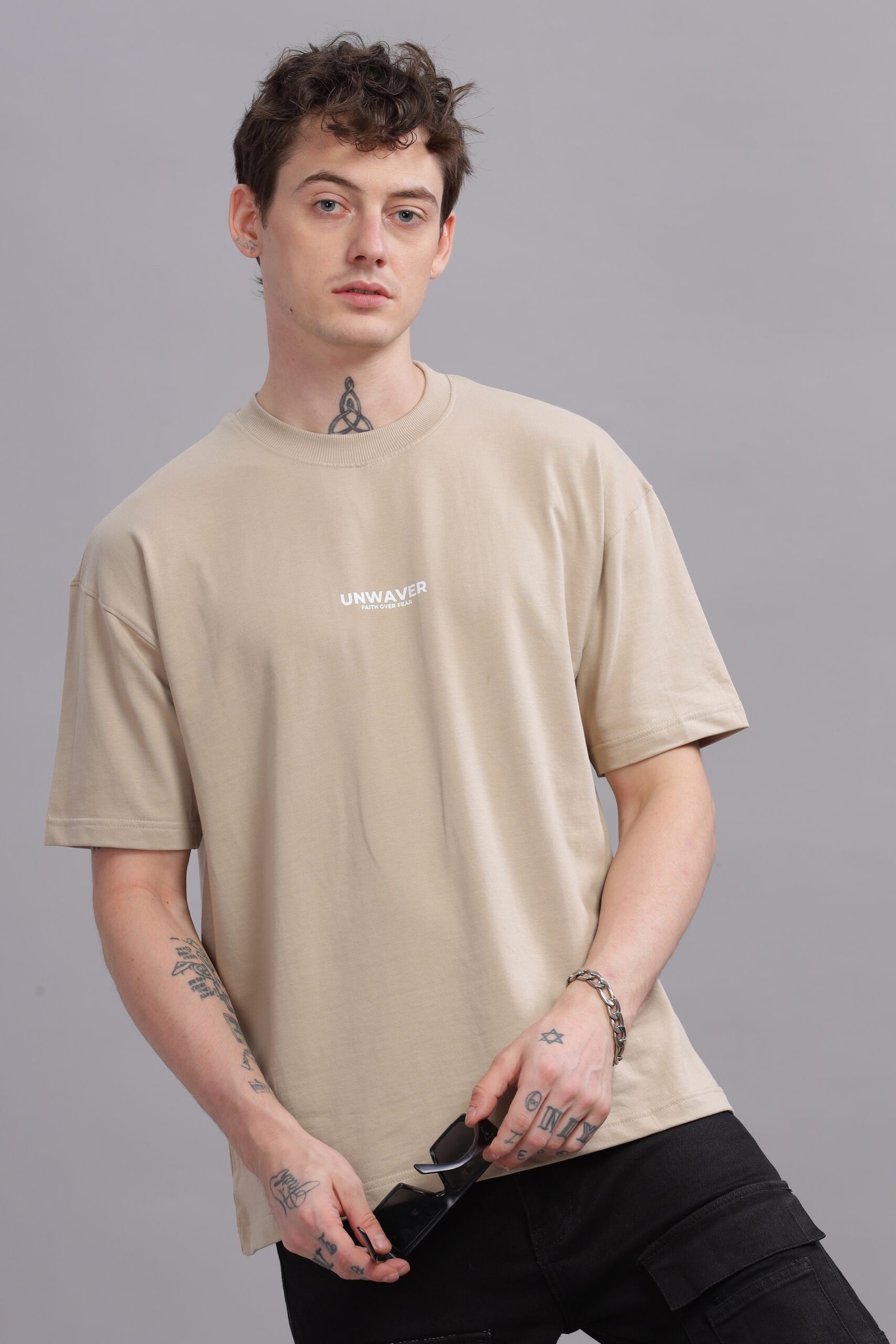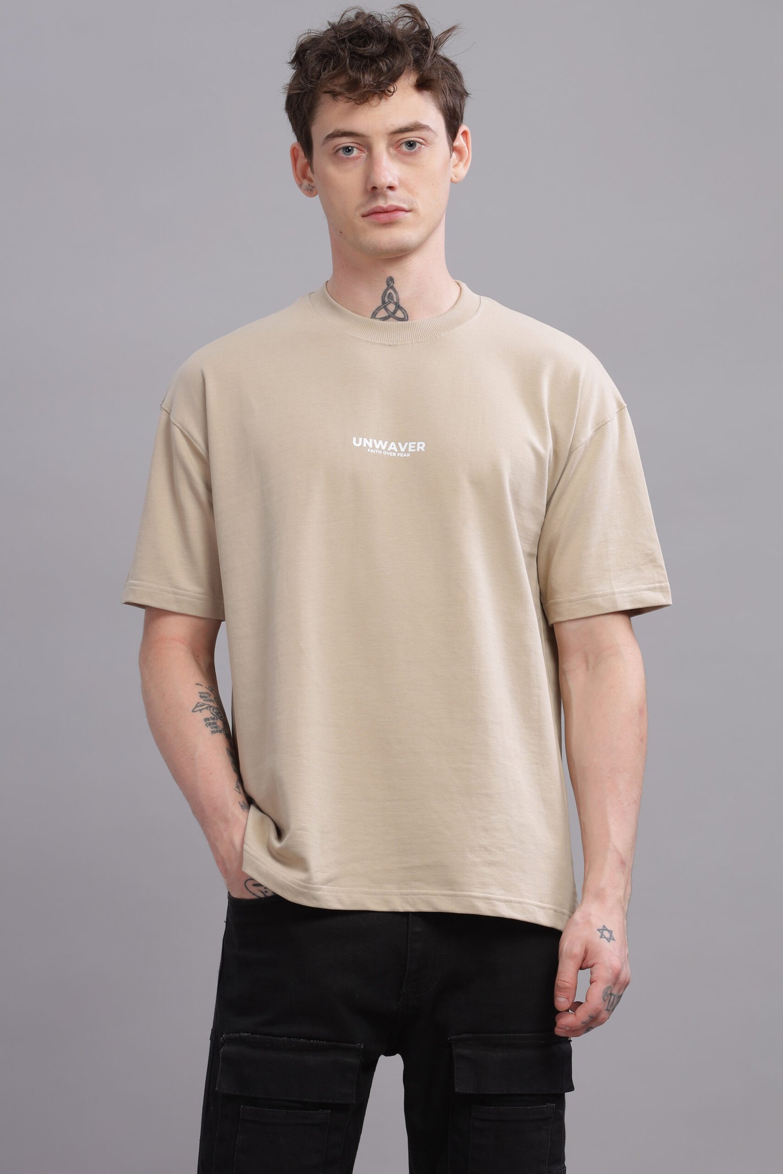 This oversized tee features a bold “UNWAVER” sleek tagline “Faith Over Fear” on the chest graphic, embodying resilience and strength. This tee merges streetwear edge with minimalist aesthetics.